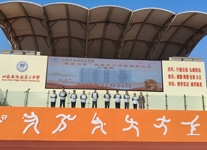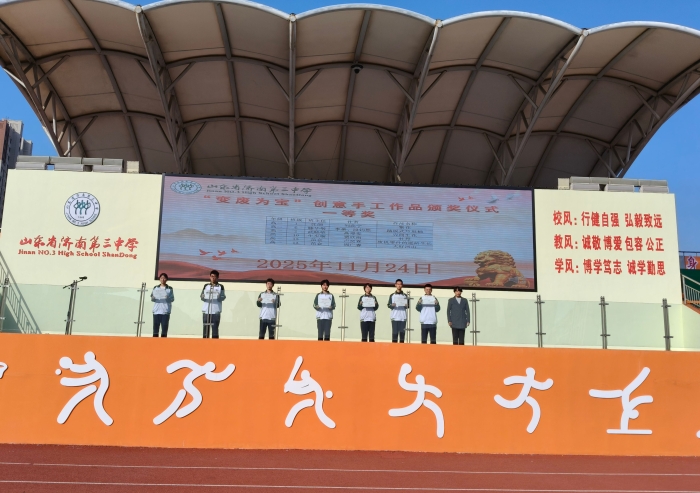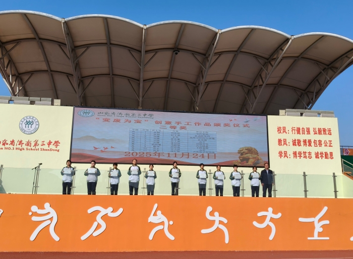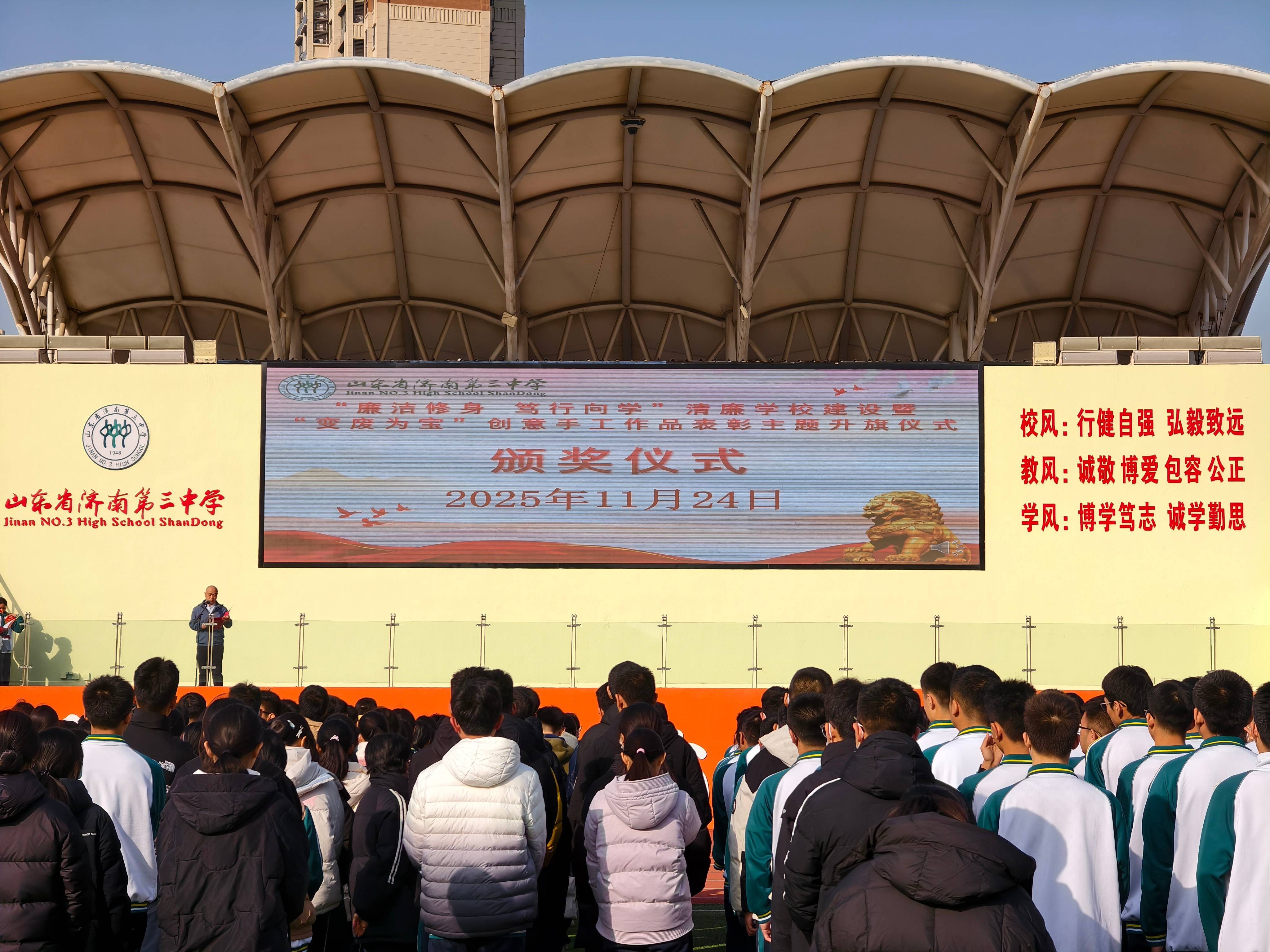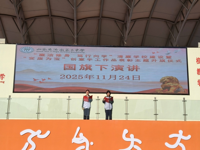 11月24日,济南三中全体师生齐聚操场,在庄严的国歌声中举行“廉洁修身 笃行向学”主题升旗仪式。此次仪式不仅是一次爱国主义教育,更是一堂融合品格塑造、学风建设与生态文明的思政课,标志着学校“清廉校园”建设进入常态化、系统化推进的新阶段。 辉映着鲜艳的五星红旗,2024级9班学生代表开始了《廉洁修身 笃行向学》的主题演讲。从包拯、海瑞等历史人物的清廉风骨谈起,结合校园生活,倡导“考试不作弊、评选不掺假、资源不浪费、为人不贪利”的日常实践,并引用“时代楷模”黄文秀的事迹,号召全体同学以“不占一分,不取一物”的操守,筑牢青春底色,让廉洁成为每位学子最清澈的品格烙印。 “少年强则国强,少年廉则国廉。”演讲强调,“笃行向学”不仅需要勤勉不辍,更应秉持实事求是、拒绝浮躁的学术态度,号召大家成为清廉文化的践行者与传播者。 升旗仪式上还进行了2025年“变废为宝”创意手工作品大赛表彰,活动评选出一、二、三等奖共27项获奖作品,涵盖微缩校园模型、环保装置、布艺改造等多种形式,充分展现出三中学子的创新意识与动手能力。“变废为宝”不仅倡导绿色生活,也与“清廉学校”理念高度契合,节约即廉洁,物尽其用即美德传承,拒绝浪费是责任担当。学校将环保教育融入廉洁文化建设,真正实现了“德智体美劳”五育融合、“廉洁与生态”双向赋能。 教育管理部主任李明在总结中强调:“清廉不是一阵风,而是一种习惯;不是口号,而是行动。我们要让清廉之风吹遍校园每一个角落。”清风正气,久久为功。济南三中将继续深化“清廉学校”建设,推动廉洁教育全面融入办学过程,营造风清气正、崇廉尚实的育人环境,助力每一位学子以清白之身、务实之风、进取之志,在实现中华民族伟大复兴的征程中,书写属于自己的清澈篇章! (撰稿:王友金 摄影:王友金 部门审核:团委 编辑:颜红 张乐 审阅:张迪)