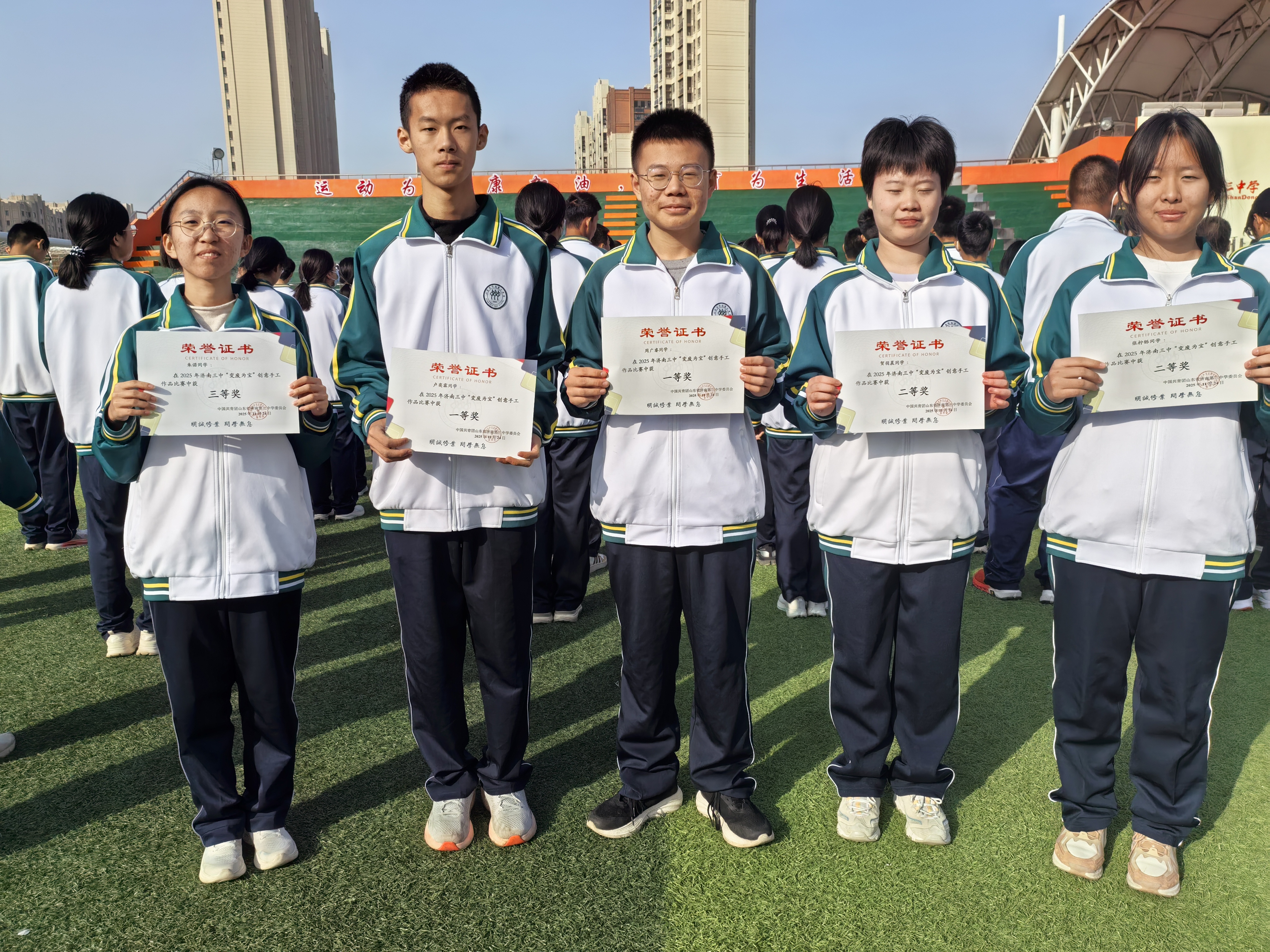 11 月 24 日上午,济南三中操场国旗飘扬,周一升旗仪式如期举行。在全体师生的见证下, 2025 年垃圾分类 "变废为宝" 创意手工比赛获奖的同学走上领奖台,标志着这场历时数周的校园环保创意活动圆满落幕,高一 13 班有多名同学获奖。 本次比赛以 "旧物换新颜,创意筑青春" 为主题,紧扣 "变废为宝" 核心理念,旨在引导学生从日常生活中发掘创意灵感,将闲置物品转化为兼具实用性与观赏性的手工作品。活动自启动以来,得到了全校学生的积极响应,同学们纷纷化身 "环保创意达人",将塑料瓶、一次性筷子、废旧纸箱、废旧物品等看似无用的废弃物,通过奇思妙想和灵巧双手赋予新的生命。 经过班级初选、学校复评等多轮严格评审,一批创意独特、制作精良的作品脱颖而出。其中,高一 13 班多名同学获奖:卢奕霖同学的作品《苹果手机》凭借巧妙的构思和精致的制作斩获一等奖,其作品利用废旧纸板等材料还原手机造型,细节处尽显巧思;周广睿同学的《大好河山》以废旧布料为原料,勾勒出一幅意境悠远的山水画卷,荣获一等奖。贺羽晨同学的《创意花瓶虫笼》将废旧网线、铁丝改造为兼具装饰性与实用性的创意花瓶样式作品,可用于饲养蝈蝈、蝉等小微型动物;张柠铄同学的《一次性筷子收纳盒》通过回收利用一次性筷子传递环保理念,这两位同学荣获二等奖;朱诺的《塑料瓶收纳盒》以简洁实用的设计,赢得三等奖。 本次 "变废为宝" 创意手工比赛不仅展现了三中学生卓越的创新精神和青春风采,更让环保理念深入校园的每个角落。获奖同学手持荣誉证书,脸上洋溢着自豪的笑容,他们表示将继续带动身边人参与环保实践,让 "旧物焕新" 成为校园新风尚。 (撰稿:高一13班小记者 摄影:苗会 编辑:张迪 张乐 审阅:张迪) |