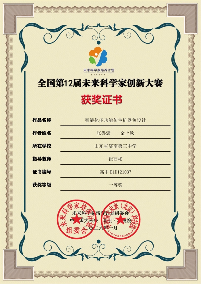 近日,在全国第12届未来科学家创新大赛中,济南三中张誉潇、金上钦同学的作品《智能化多功能仿生机器鱼设计》惊艳亮相,从全国各省市优秀参赛作品中脱颖而出,勇夺全国一等奖! 这一创意的萌芽,源于他们对泉城济南的热爱。时常关注护城河、大明湖水质变化的张誉潇和金上钦,从游鱼的灵动姿态中获得启发:能否造一条能监测水质、清理垃圾的“鱼”?在崔西彬老师的悉心指导下,历经数月的构思、设计与反复打磨,最终呈现的作品兼具创新性、实用性与科学性,得到了评委专家组的高度认可。 荣誉的背后,体现了三中学子的社会责任感与科学素养,也折射出济南三中在科学教育上的育人成果。近年来,学校锚定新时代高素质人才培养方向,签手七所科学教育联合体学校成立“未来科学院”,完善科学教育课程体系,邀请专家开展讲座,组织科技节活动,校园内的科技创新氛围日益浓厚,创新的种子正在生根发芽。未来,济南三中将继续深耕科学教育,助力更多学子在科技创新的道路上勇攀高峰,绽放光彩! (供稿:市南教学管理部 初审:吴明 复审:孙玉玺 终审:姜明 编辑:颜红 张乐 核发:张迪) |