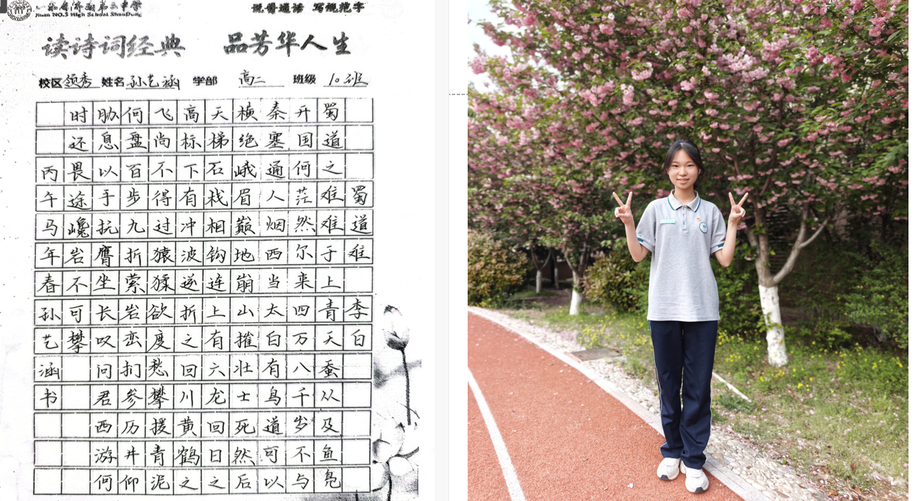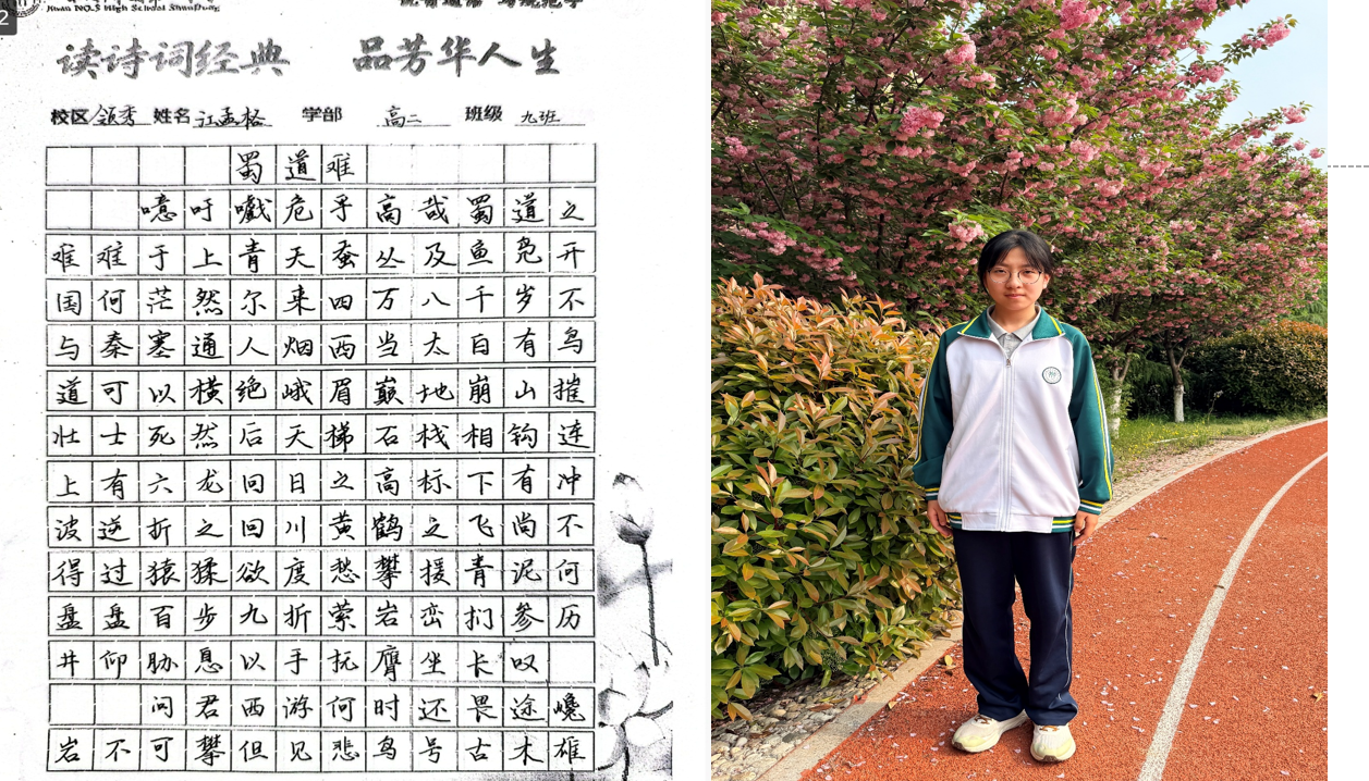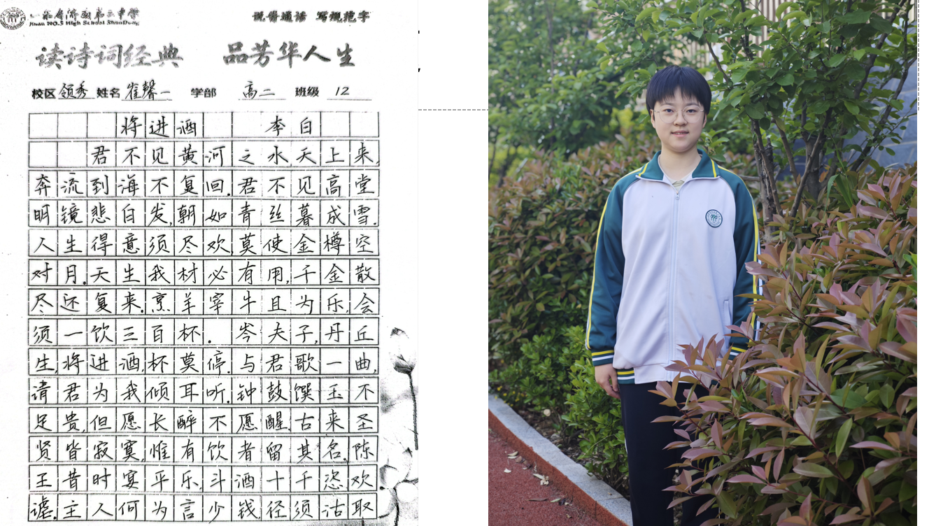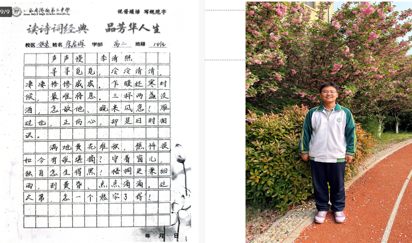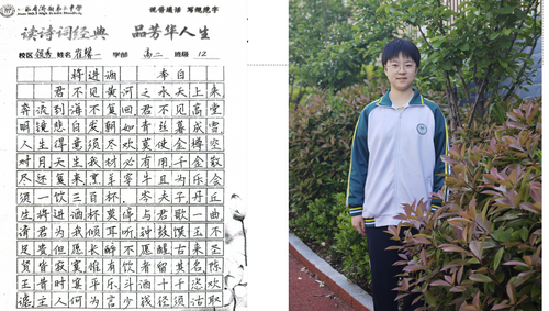 “笔走龙蛇书壮志,诗吟千古品芳华。”近日,高二学部“书诗词经典,品芳华人生”主题活动圆满落幕。作为领秀校区多彩学科节系列活动之一,本次活动以“书写经典、感悟人生”为内核,通过诗词书写、情景演绎、分享交流等多元形式,带领同学们在笔墨与诗韵中触摸传统文化脉络,体悟经典诗词中蕴藏的人生智慧。 活动自筹备以来,便得到高二学子的热烈响应。在前期举办的“班级诗词书写大赛”中,同学们以笔为媒,将对诗词的理解融入书法创作:或用楷书工整抄录《兰亭集序》,一笔一划间仿佛映出王羲之的飘逸;或以行书挥洒《将进酒》,墨色浓淡中尽显李白的豪迈与不羁;还有同学以隶书写下《诗经·蒹葭》,古朴的笔画里流淌着“溯洄从之”的怅惘与追寻。一幅幅作品悬挂于教学楼走廊,串联成一条“诗词长廊”,成为校园里一道别具韵致的文化风景线。 本次活动旨在以诗词为纽带,让学生在“读、写、悟、演”中提升语文素养,传承文化基因,为书香校园建设再添一抹亮色。笔墨留痕,诗心永驻,活动不仅让同学们领略了中华诗词的无穷魅力,更让经典与青春碰撞出别样的火花,为高中生活涂上一抹温润而厚重的文化底色。 (撰稿:苏梅 摄影:褚冬婷 部门审核:领秀高二学部 编辑:颜红 张乐 审阅: 张迪) |