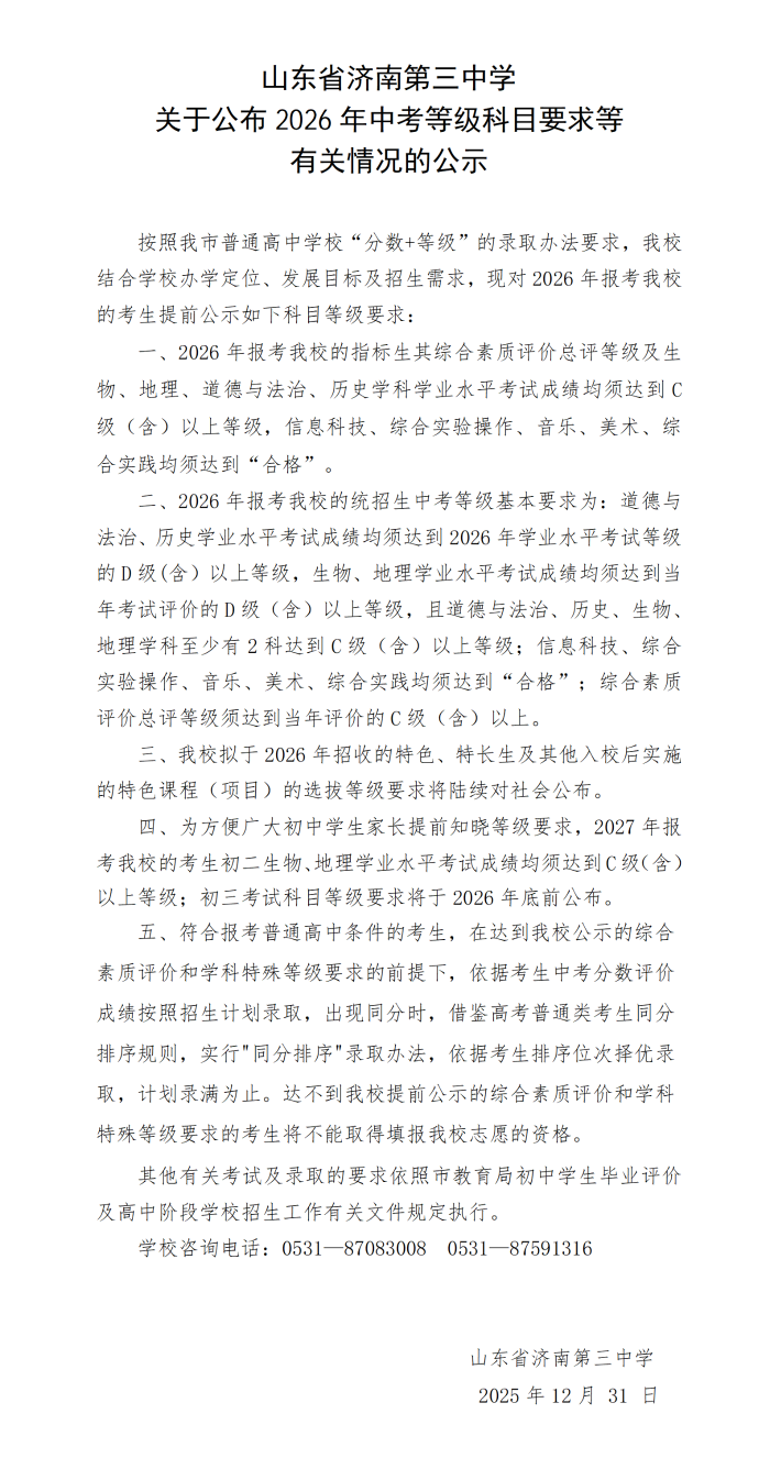 山东省济南第三中学关于公布2026年中考等级科目要求等有关情况的公示